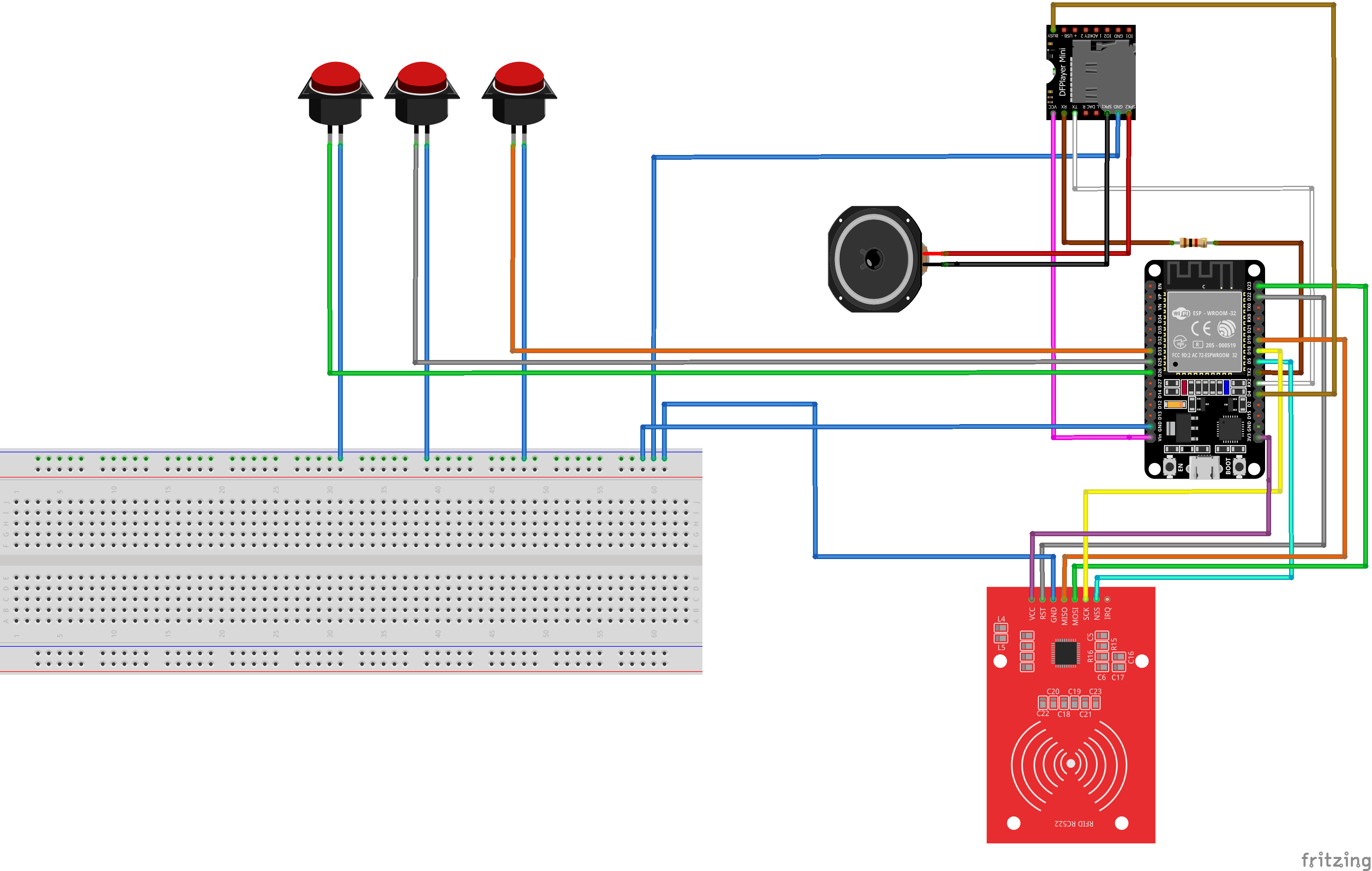 ich habe das bereits erwähnte Pin-Diagramm verwendet. Leider bin ich in eine ähnliche Situation wie m4tt_90 geraten. Ich musste VSCode verwenden, da der ESP32 keine Verbindung zum DFPlayer herstellen konnte, wenn der Code mit Arduino IDE kompiliert und bereitgestellt wurde. Mit VSCode Build kann ich jedoch erfolgreich Karten/Chips mit dem RC522 trainieren. Ich weiß nicht, ob dies eine Einschränkung des DFPlayers ist, aber ich kann die Lautstärke nicht einstellen, wenn keine Musik abgespielt wird. Ein weiteres Problem tritt 3–4 Sekunden nach dem Start eines Songs auf: Der ESP32 glaubt, dass der Player angehalten wurde (der BUSY-Pin bleibt während dieser Zeit niedrig). In diesem Fall bleibt der Player bei der Wiedergabe der MP3-Datei hängen und nimmt keine Befehle mehr entgegen. Hier ist das Log: