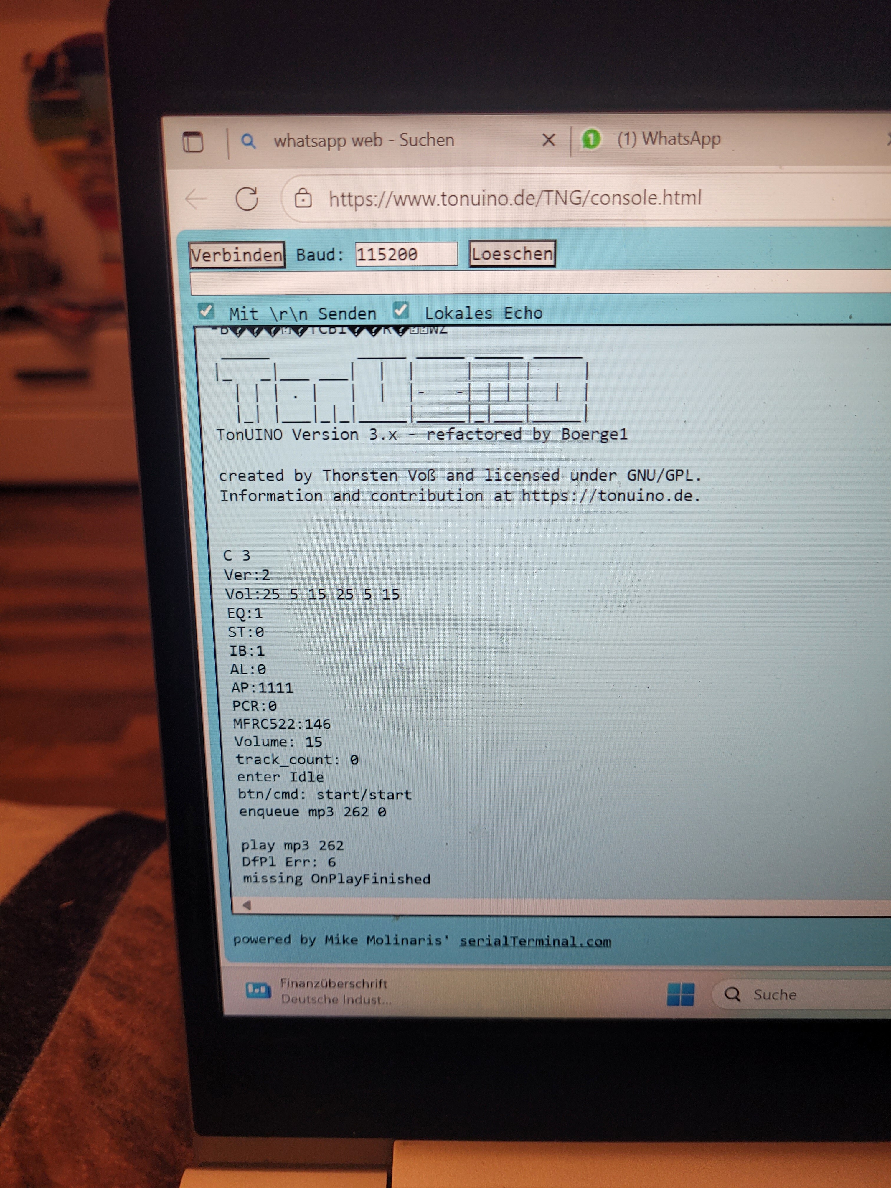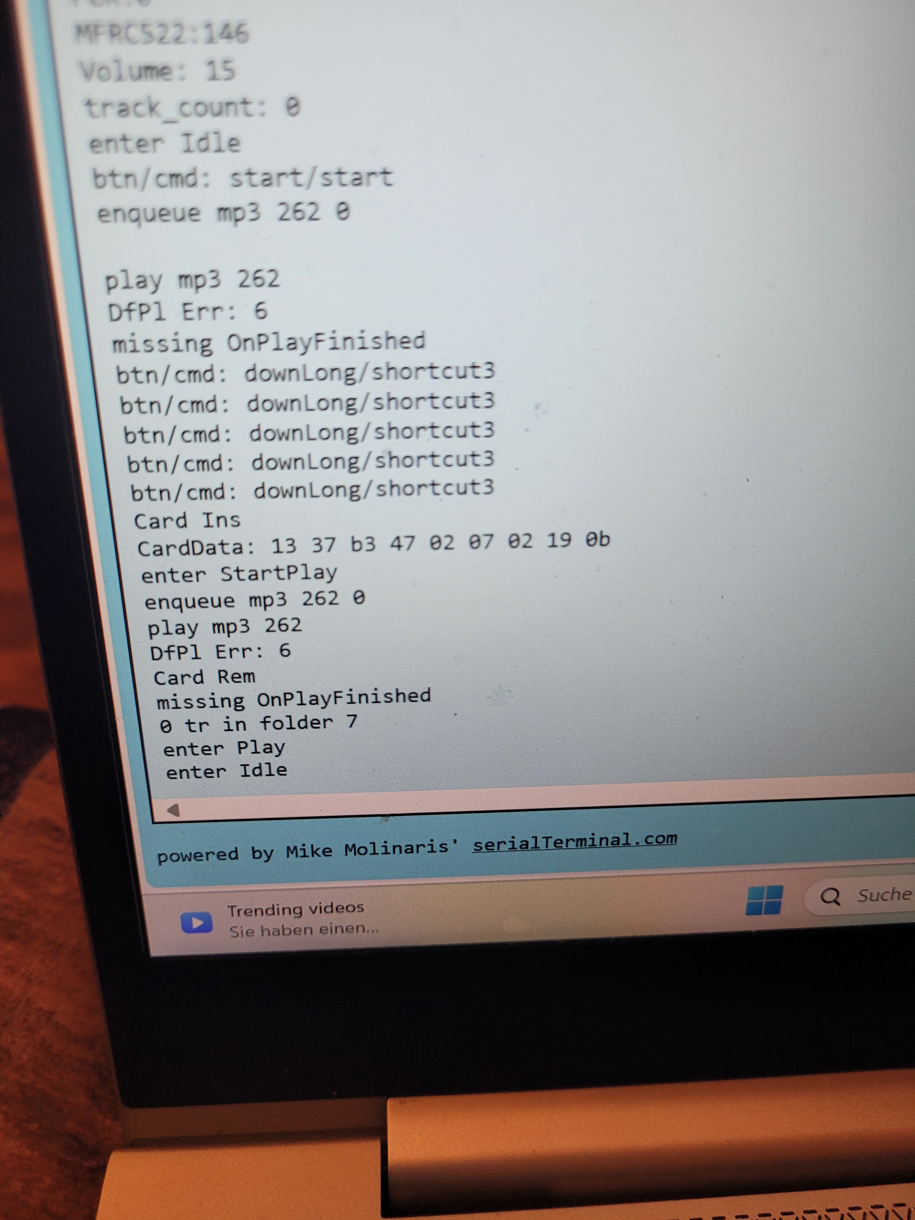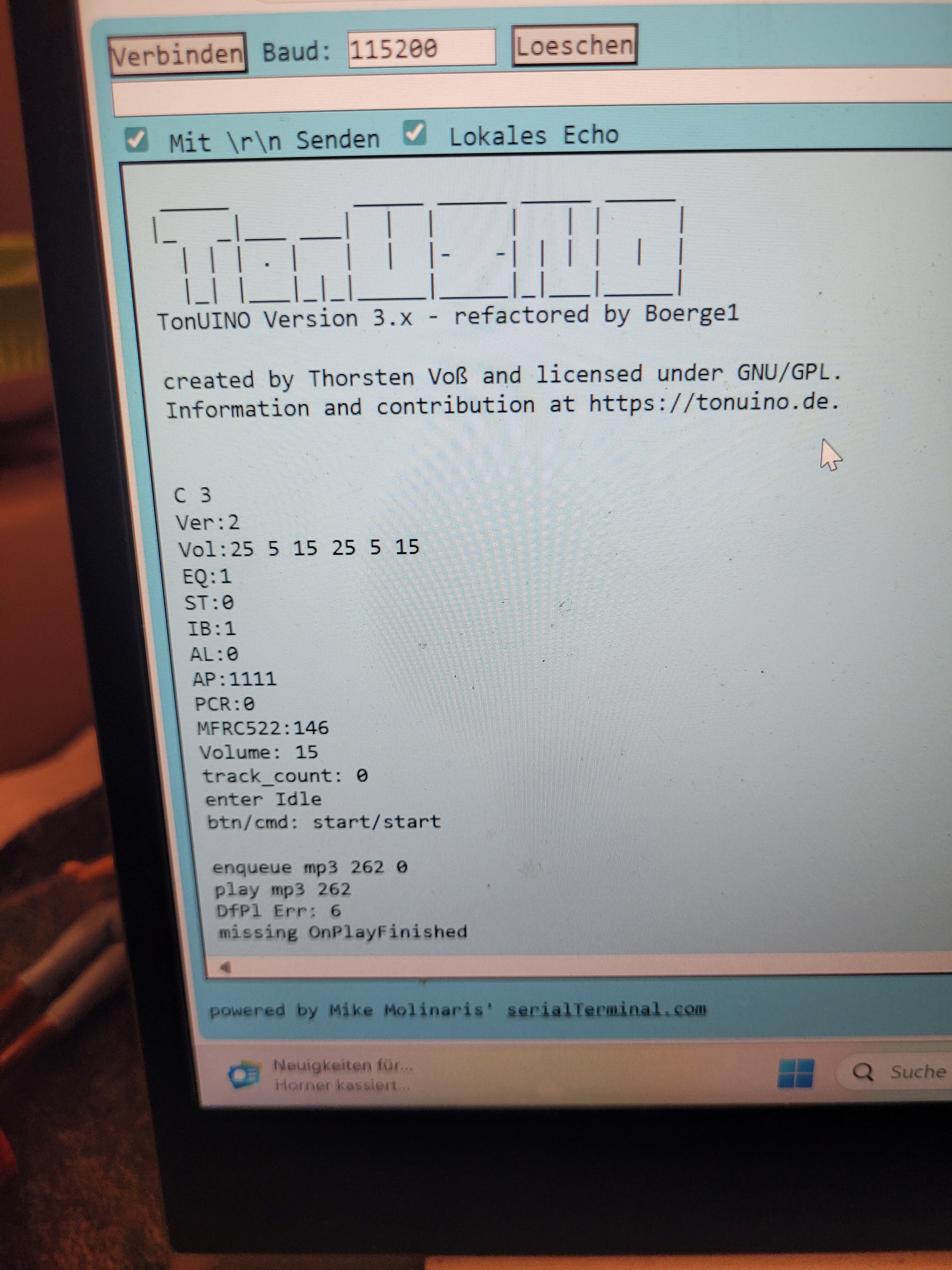 Dann ist der nächste Schriit um herauszufinden warum du nichts hörst der serielle Monitor. Dort kann man sehen ob die RFID Karte erkannt wird, ob der Player die Datei findet, die er abspielen will und viele weitere Indizien woran es liegt.