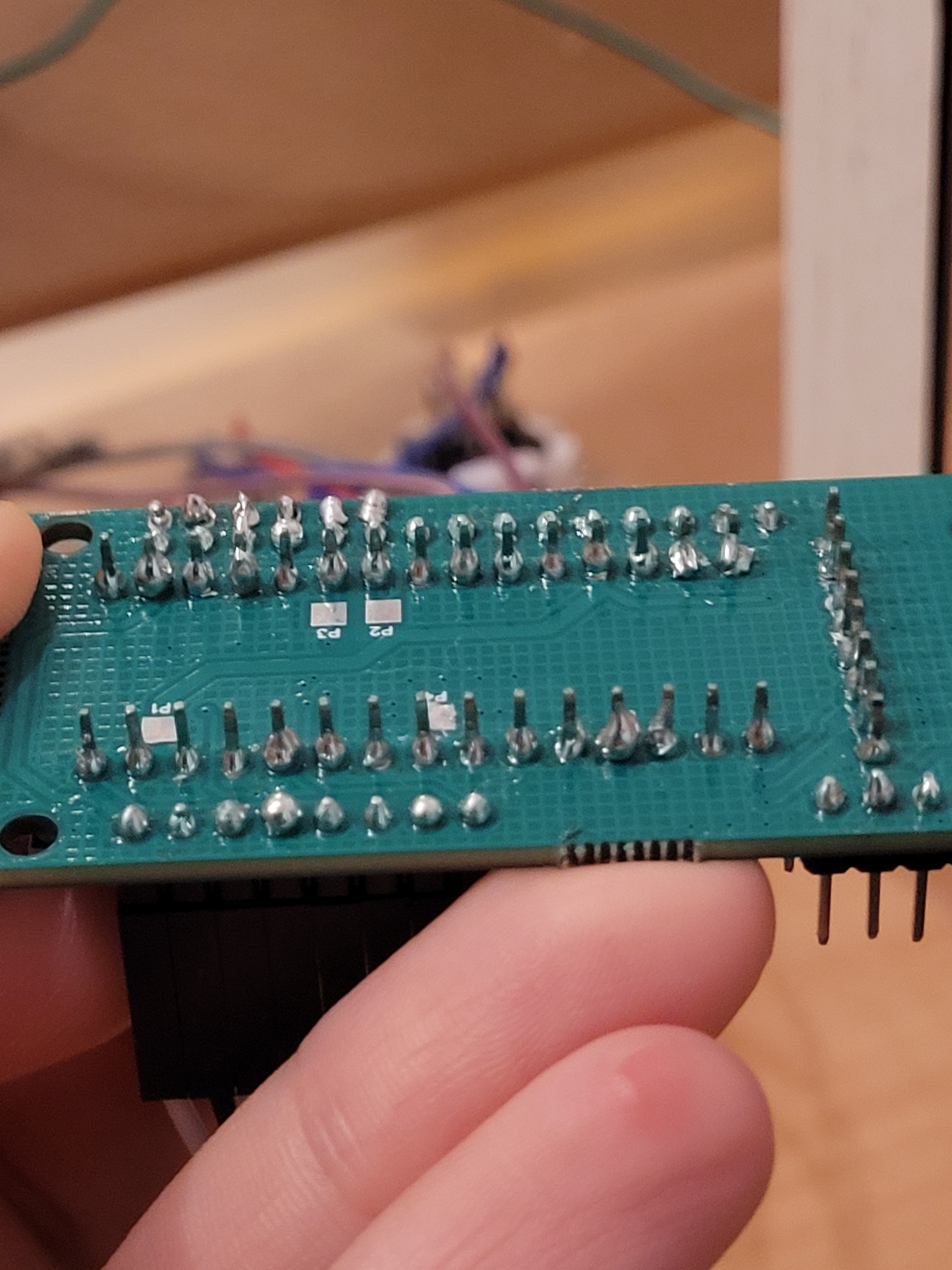 Für mich sieht das nach einem Kurzschluss am downButton aus. An anderen Pins ist zuviel Lötzinn und Pins mit zu wenig Zinn gibt es auch.