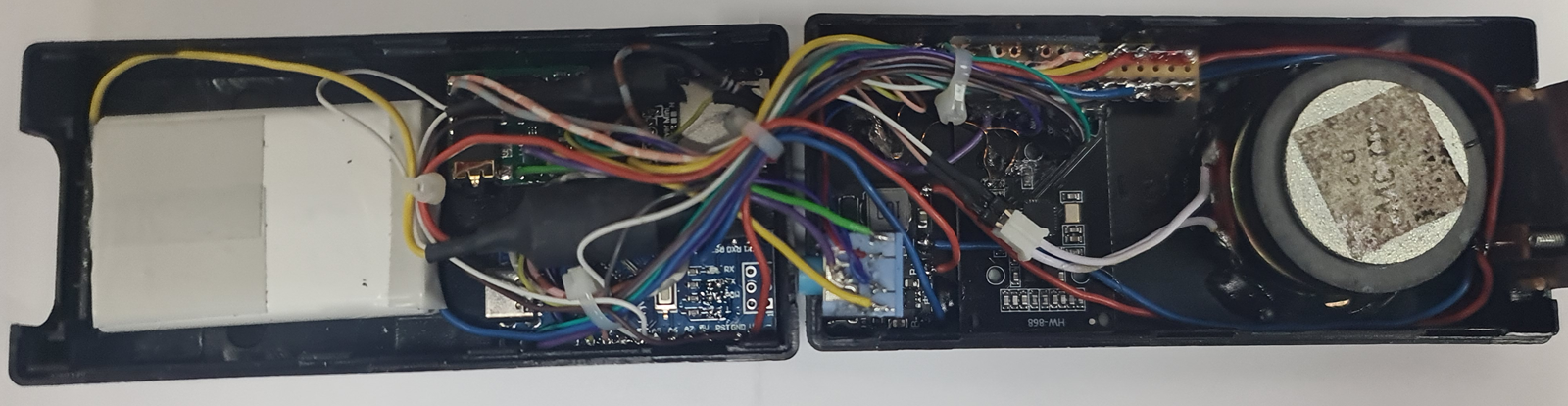 Das Innenleben von Links nach Rechts: Akku LiIon 900mAh, Verstärker Kopfhörer, DF Player (GD3200D), Arduino Nano (USB C Version), Lochraster für die 5 Taster und 5 Volt Verteilung, USB C Ladeplatine (mit StepUp und unterspannungsschutz), NFC Leser im Mini Format, Kopfhörerbuchse, 3 W Lautsprecher, Schalter