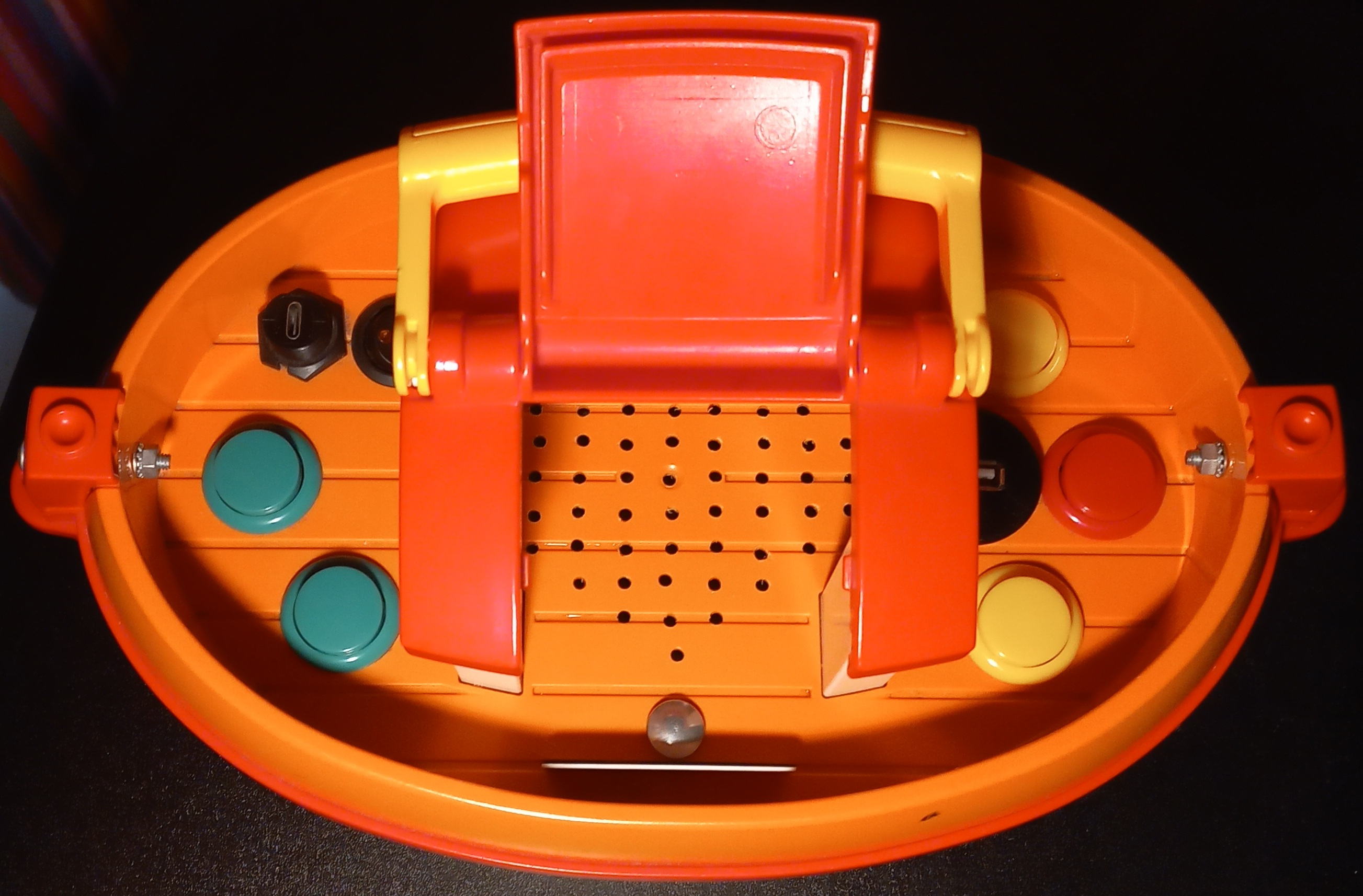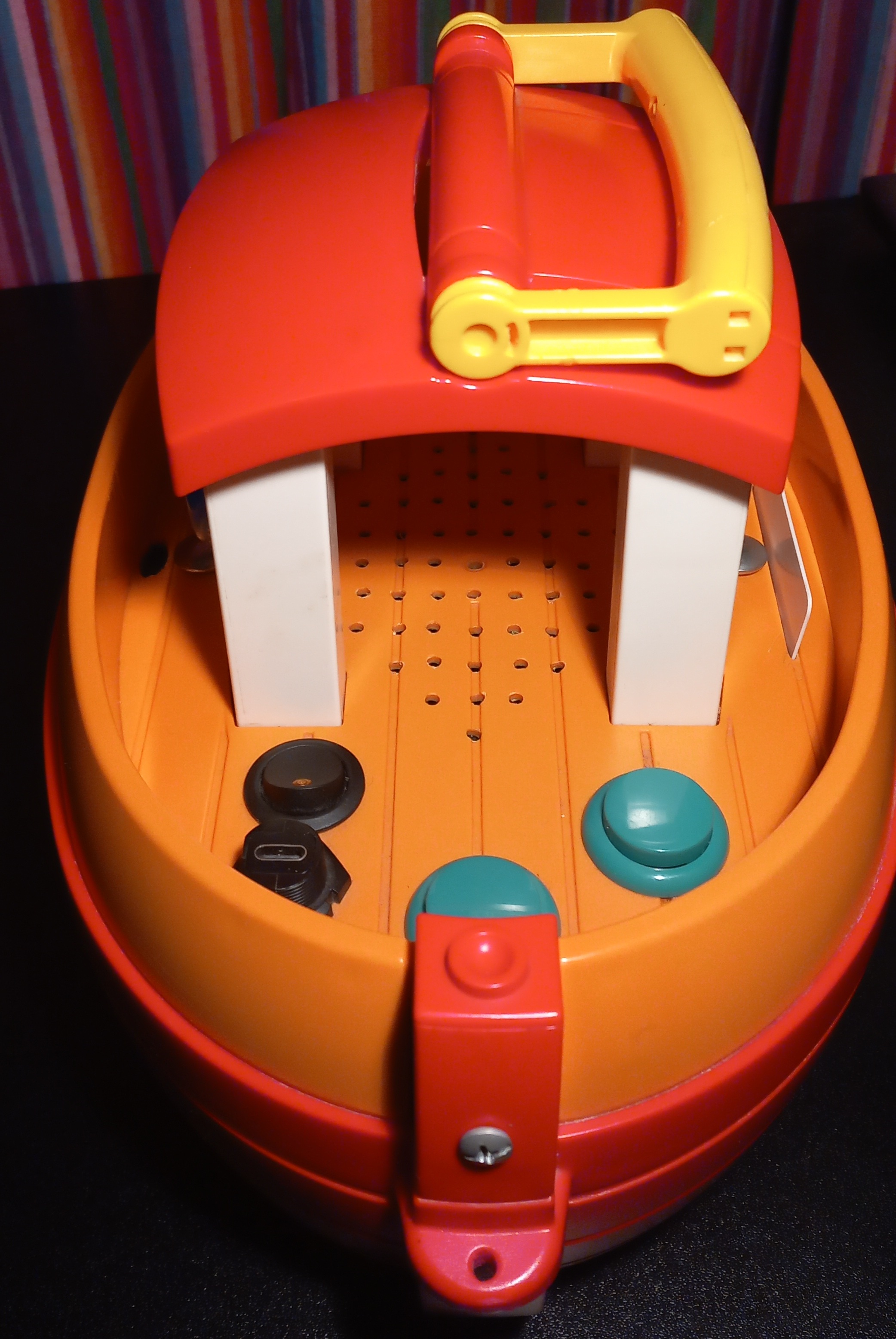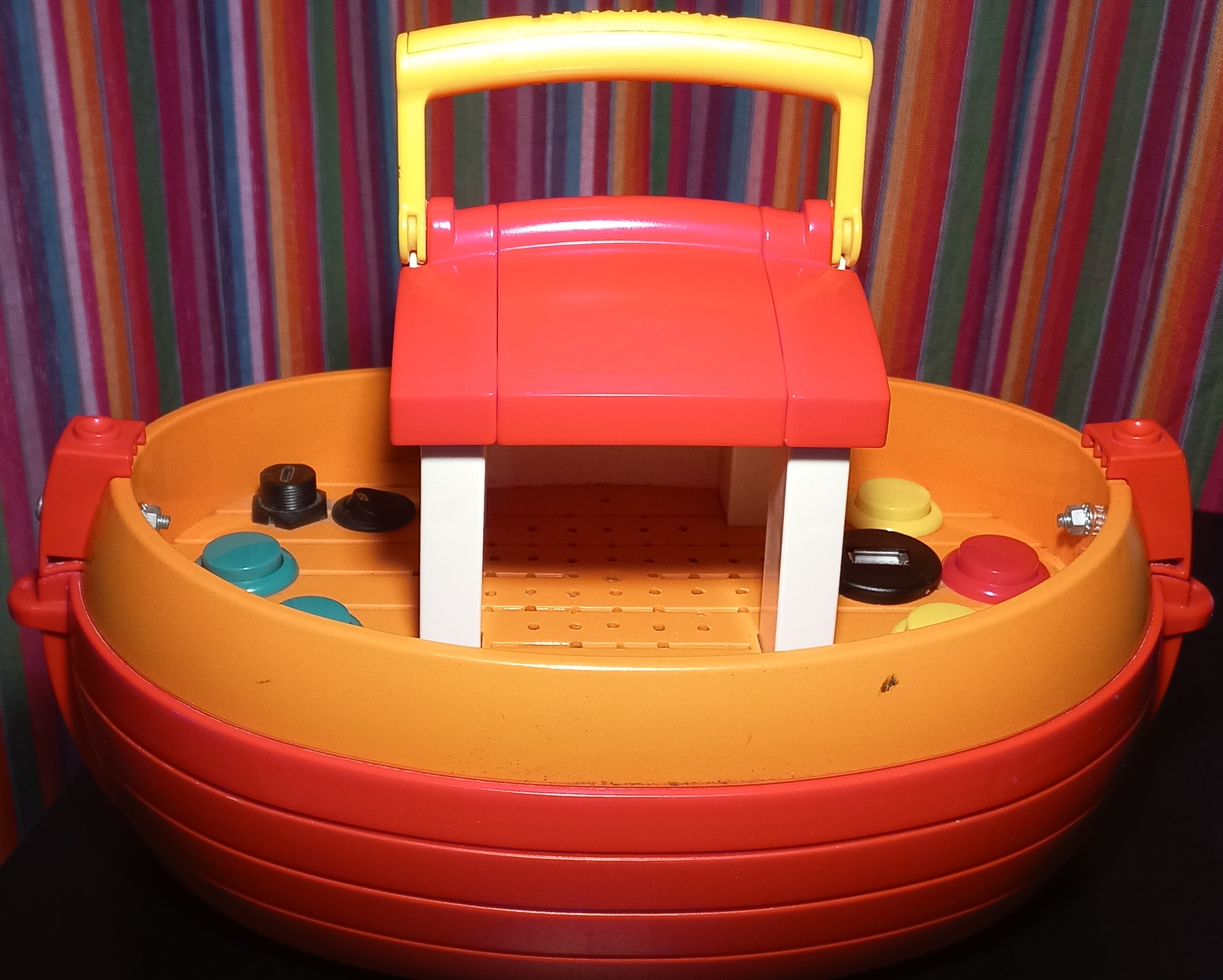 Die Wahl fiel auf ein Schiff von Playmobil. Es ist kleinkindgeeignet, sehr robust und wasserabweisend. Der obere Teil lässt sich vollständig abnehmen, so dass der Innenraum Platz für sämtliche Bauteile bietet. Ein Tragegriff ist bereits vorhanden. (Eventuell hätte man den Player auf dieser Basis auch vollständig badewannentauglich konzeptionieren können